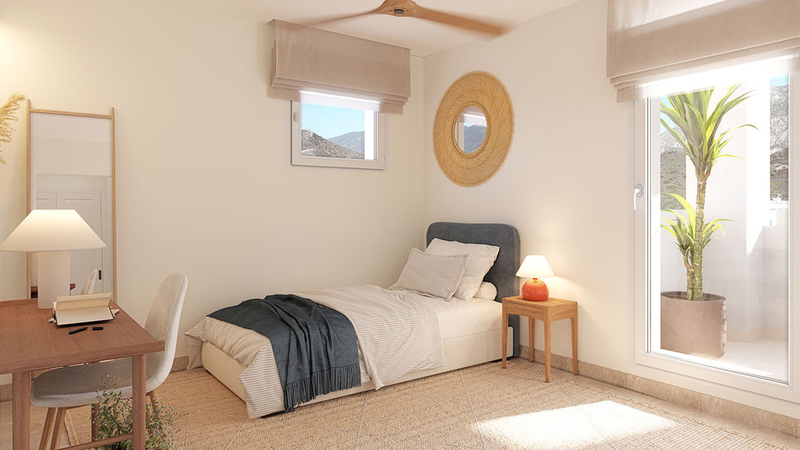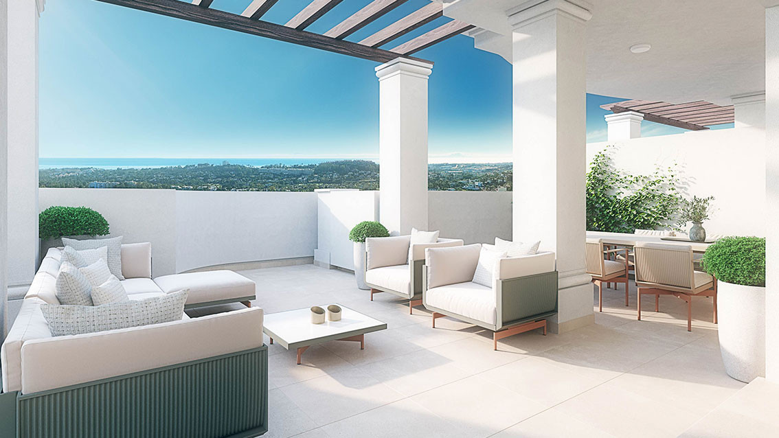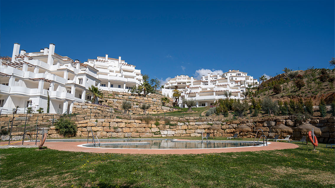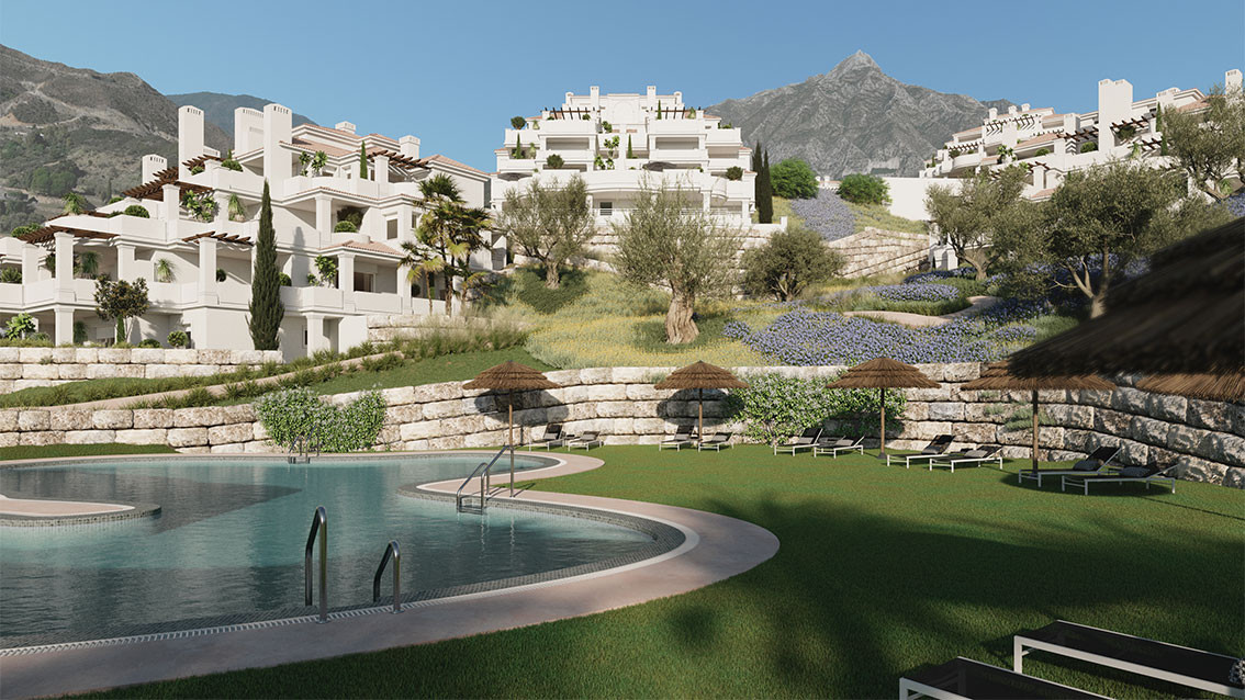 Setting: Close To Golf, Close To Sea, Close To Marina Orientation: South East Condition: New Construction Pool: Communal Climate Control: Hot A/C, Cold A/C Views: Mountain, Panoramic, Garden, Pool, Courtyard Features: Lift, Near Transport, Private Terrace, Solarium, Gym, Storage Room, Ensuite Bathroom Kitchen: Fully Fitted Garden: Communal Security: 24 Hour Security Parking: Underground Category: New Development