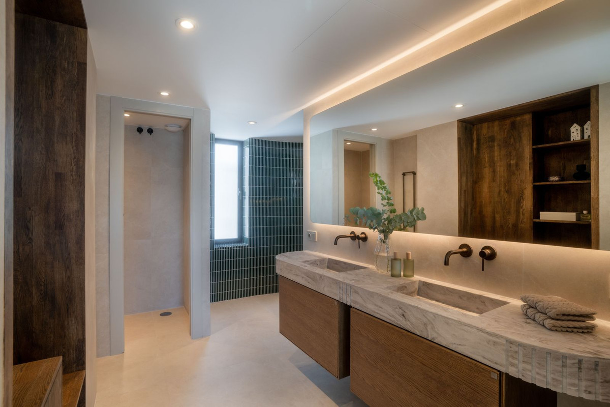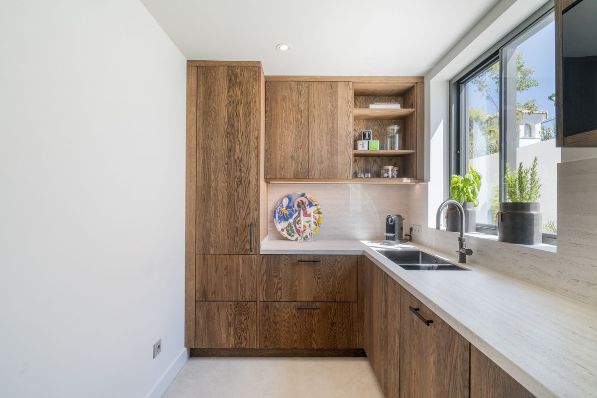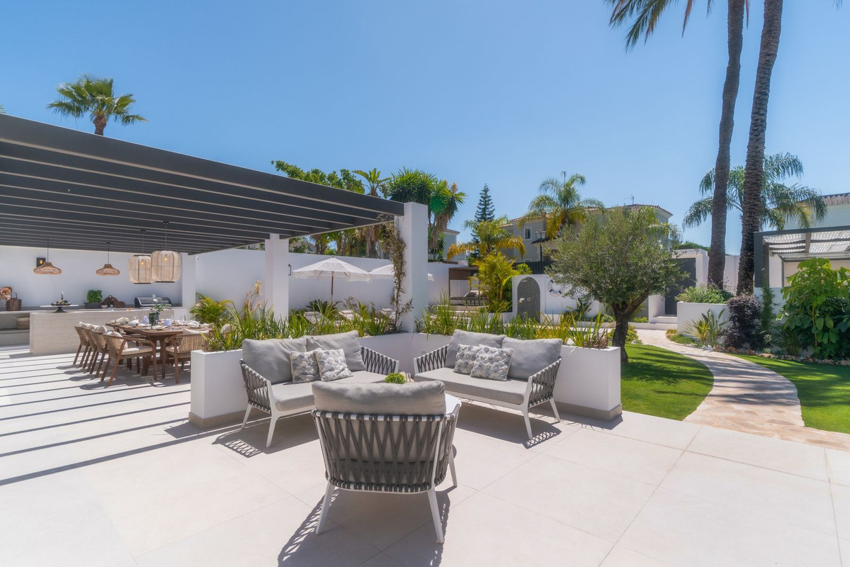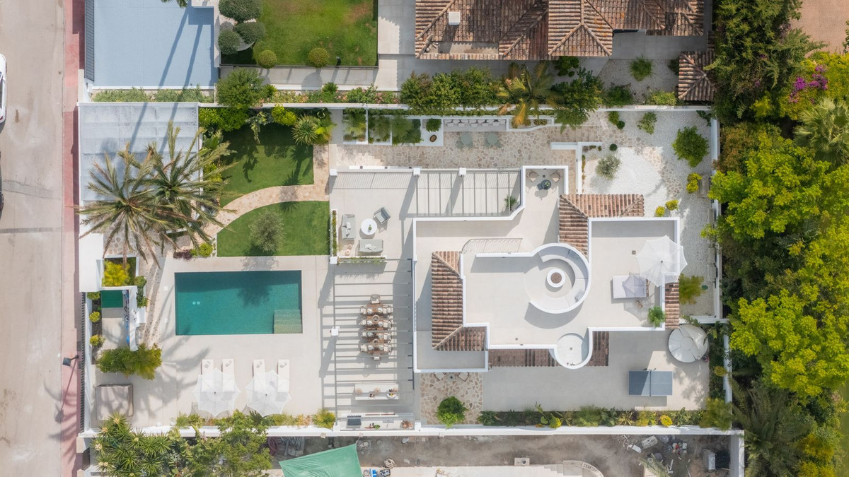 A Refined Retreat in Aloha / Las Brisas, Marbella Welcome to a beautifully renovated luxury villa located in the prestigious Aloha / Las Brisas area of Marbella. This elegant home blends timeless Mediterranean character with sleek contemporary design, and enjoys a prime location just minutes from world-class golf courses, exclusive dining, designer shopping, international schools and Marbella’s finest beaches. Set on a 815 m² plot, the house offers 475 m² of refined living space, thoughtfully distributed across three levels, with sun-drenched terraces and lush garden areas perfect for both relaxation and entertaining. The villa features six ensuite bedrooms, each with its own private bathroom, offering maximum comfort and privacy across all levels: On the ground floor, you’ll find a generous ensuite guest bedroom. The upper level hosts the master suite, complete with a private bathroom and direct access to a spacious terrace with beautiful views. Two additional ensuite bedrooms on this floor provide comfort and privacy — one with its own terrace and the other with a charming French balcony. On the lower level, two further ensuite bedrooms offer ideal accommodation for guests, family members, or staff. The open-plan main floor is tailored for modern living, featuring a bright and stylish lounge alongside a bespoke Swedish kitchen fitted with premium Miele appliances, dark oiled Oak cabinetry, and sleek Dekton countertops. The adjacent dining area is perfect for both intimate family meals and entertaining guests. Technical highlights include: Water-based underfloor heating throughout the entire house Full Daikin climate system with Airzone control in every room Integrated Sonos sound system covering the ground floor, lower level, and garden Step outside into the beautifully landscaped garden, featuring al fresco dining areas, a built-in BBQ, sunbathing zones, and a private south-facing pool that enjoys all-day sunshine – creating a tranquil oasis for year-round outdoor living. A true highlight is the rooftop terrace, offering panoramic views over the surrounding mountains and valley. This elevated lounge area is perfect for sunset cocktails, morning yoga, or simply enjoying the peace and privacy of your own rooftop haven. On the lower level, the home transforms into a full-scale entertainment and wellness retreat, complete with a custom bar and lounge, a private cinema room, and a dedicated spa area featuring a traditional hammam, Finnish sauna, plunge bath, and dual rain showers — bringing the full luxury experience into your everyday life.