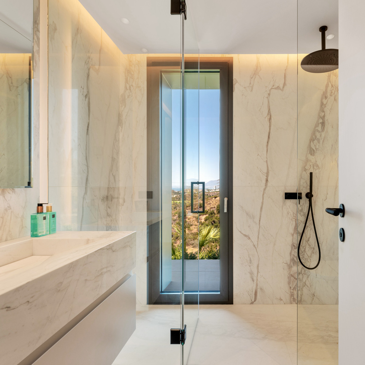 Set on a south-facing plot of over 1,000 m², this newly built villa delivers sweeping views of the Mediterranean Sea and surrounding mountains. Developed by Sands Villas and designed by Gonzalez Jacobson, the property combines sharp modern architecture with natural textures and floor-to-ceiling glass for seamless indoor-outdoor living. The main level features an open-plan layout where the living, dining and kitchen areas flow to expansive terraces through full-width sliding doors. A private infinity pool, covered dining lounge and landscaped gardens create a true extension of the interior spaces. A private driveway with covered carport provides convenient access and secure parking. Inside, the villa is finished to a high standard with elegant stone surfaces, warm wood cabinetry and discreet lighting. Generous bedrooms include stunning ensuite bathrooms, while the master suite offers direct terrace access and panoramic sea views. With its modern design, private setting and exceptional vistas, El Rosario 430 is a standout contemporary home in Marbella East.