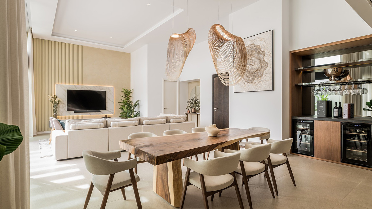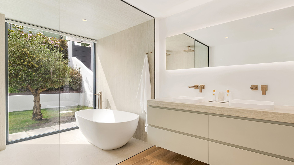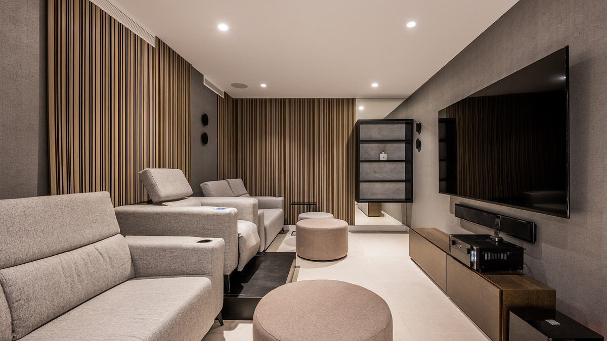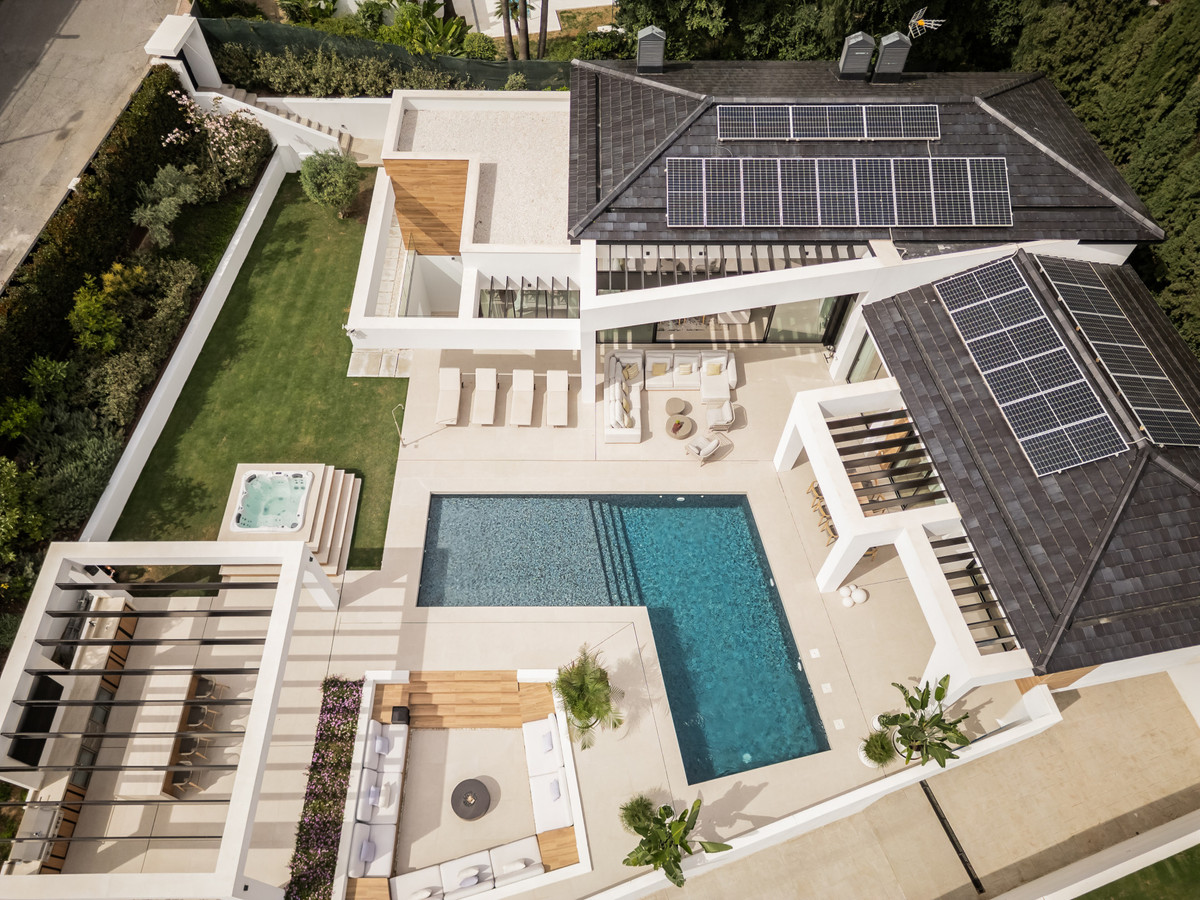 Bright and inviting home set in the quiet residential area of Los Naranjos Golf, in the heart of Marbella’s Golf Valley. Well connected and convenient, it's just minutes from a wide range of restaurants, cafés, shops, international schools, top golf courses and Puerto Banús. The villa is built mainly all on one level plus lower level, quite rare to find on the market. It has a fresh, modern feel throughout. Decorated in a soft, neutral palette, it feels relaxed, luminous and welcoming. The layout is practical and flows well. On the main level, the bright, open-plan living and dining area connects seamlessly to a modern kitchen designed by BD Home & Living with Siemens appliances and a large central island which anchors the space, perfect for everyday living and entertaining alike. Large sliding doors open onto a generous terrace of approximately 180 m², seamlessly connecting the interior with the landscaped garden. Four en suite bedrooms and a guest toilet complete the ground floor. Outdoor living is a highlight. There’s an L-shaped saltwater pool, a chill-out area with a fire pit for cooler evenings, a barbecue/bar area with TV, and a jacuzzi – perfect for entertaining family and friends year-round. The lower level of the home includes two additional bedroom suites, a guest toilet, cinema room, utility room, and a private garage for two cars. Features such as a home automation system, Aerothermal underfloor heating, solar panels and a fireplace in the main living area add both comfort and convenience.