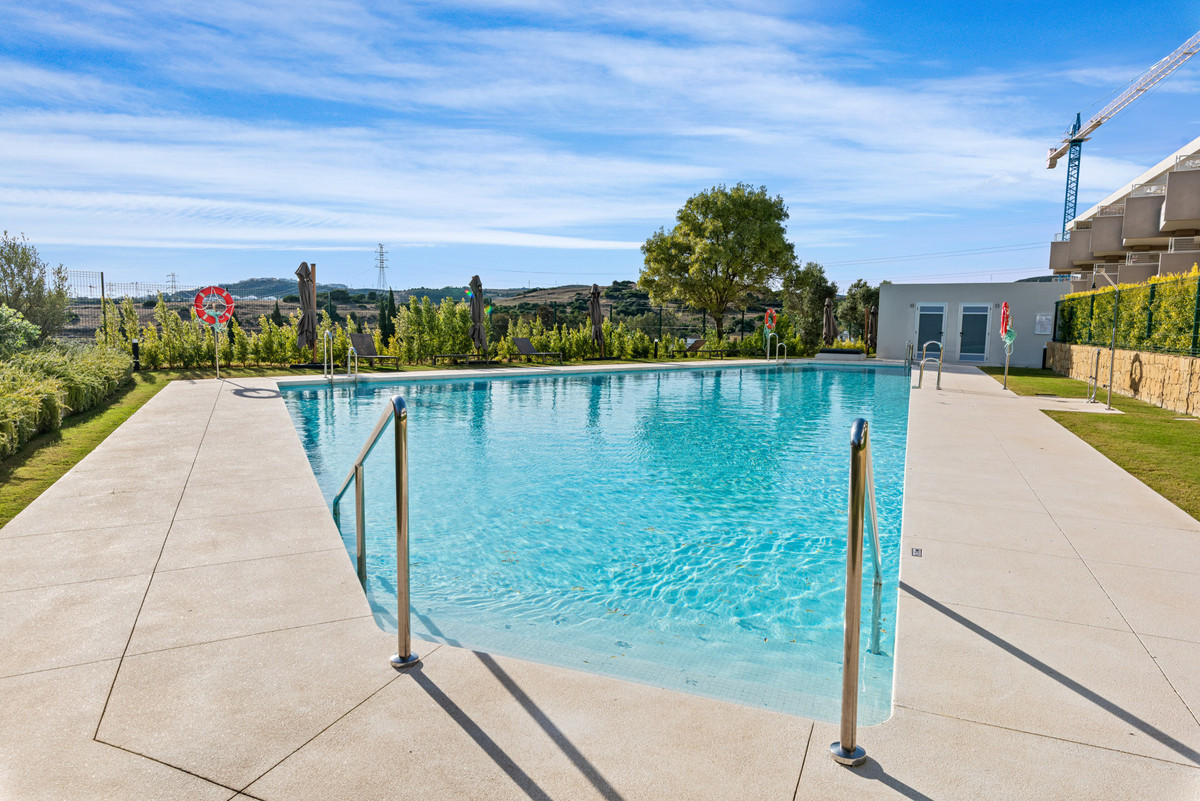 Ground-floor apartment in a recently completed complex in the heart of Estepona Golf The development is recently completed and offers a modern design, communal gardens and a shared swimming pool. The location provides quick access to Estepona town, local services and the wider Costa del Sol. The property overlooks the communal pool and enjoys west-facing views across the golf course. The layout includes an open-plan main living area with air conditioning and a fully fitted kitchen equipped with dishwasher, oven, hob, washing machine and dryer. The space opens directly onto a covered terrace and a small private garden. There are two bedrooms and two bathrooms. The principal bedroom includes an en-suite shower room and has direct access to the terrace. The second bedroom is served by a separate bathroom. Both bedrooms have air conditioning. The apartment is sold with an outside parking space. It is a practical option within a well-maintained development close to the golf course and surrounding amenities.
