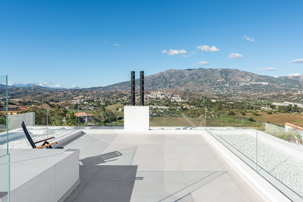 CONTEMPORARY LUXURY VILLA WITH PANORAMIC VIEWS – BUILT 2024 Welcome to this spectacular newly built contemporary villa, a masterpiece of modern design and comfort completed in 2024. Positioned to capture sweeping panoramic views of the valley, mountains, and the Mediterranean Sea, this residence offers exceptional privacy paired with elegant, light-filled living spaces. MAIN LEVEL – OPEN PLAN LIVING & SEAMLESS INDOOR-OUTDOOR FLOW The entry level features a spacious lounge and an open-plan designer kitchen with floor-to-ceiling windows that frame the stunning mountain scenery. From here, the living spaces extend naturally toward the meticulously landscaped garden and the heated saltwater infinity pool. This level also includes a generous guest suite with an en-suite bathroom, as well as a stylish guest toilet. A private elevator connects all floors of the home. UPPER LEVEL – LUXURY BEDROOM SUITES & PANORAMIC TERRACES Upstairs, you’ll find two expansive bedroom suites, each with its own en-suite bathroom and direct access to a large terrace offering breathtaking views. A separate south-facing terrace leads to a spiral staircase taking you up to the impressive roof terrace. ROOF TERRACE – 360° VIEWS & COMPLETE PRIVACY The spacious rooftop solarium boasts uninterrupted 360-degree views of the valley, mountains, and the sea. It is an ideal space for installing a jacuzzi, creating a chill-out lounge, or simply enjoying peaceful sunsets in total privacy. LOWER LEVEL – FLEXIBLE SPACE & GENEROUS GARAGE The ground floor offers abundant additional space, including storage rooms, a laundry room, utility room, and a large garage accommodating more than four cars. This level also presents exciting possibilities for personalization: transform part of the space into a cinema room, gym, wine cellar, or even an independent guest apartment. OUTDOOR LIVING – DESIGNED FOR SUN, SHADE & RELAXATION The exterior has been thoughtfully planned with multiple areas for dining, relaxing in the shade, or sunbathing by the heated infinity pool. The eco-friendly pool features an electric cover that harnesses solar energy to naturally warm the water. FEATURES – High-quality materials throughout – Smart home system controlled via mobile app – Heated saltwater infinity pool with solar-assisted cover – Elevator to all floors – Extensive terraces including a full 360° roof terrace This villa combines striking contemporary architecture with top-tier functionality, creating a luxurious private retreat designed for modern living at its finest. Distances: Airport 25 min, 30Km Shopping Center Miramar 8 min, 4,4Km Fuengirola 15 min , 6Km Beach 9 min, 5Km Marbella 30 Min, 28Km Malaga Center 40 min, 38Km.
